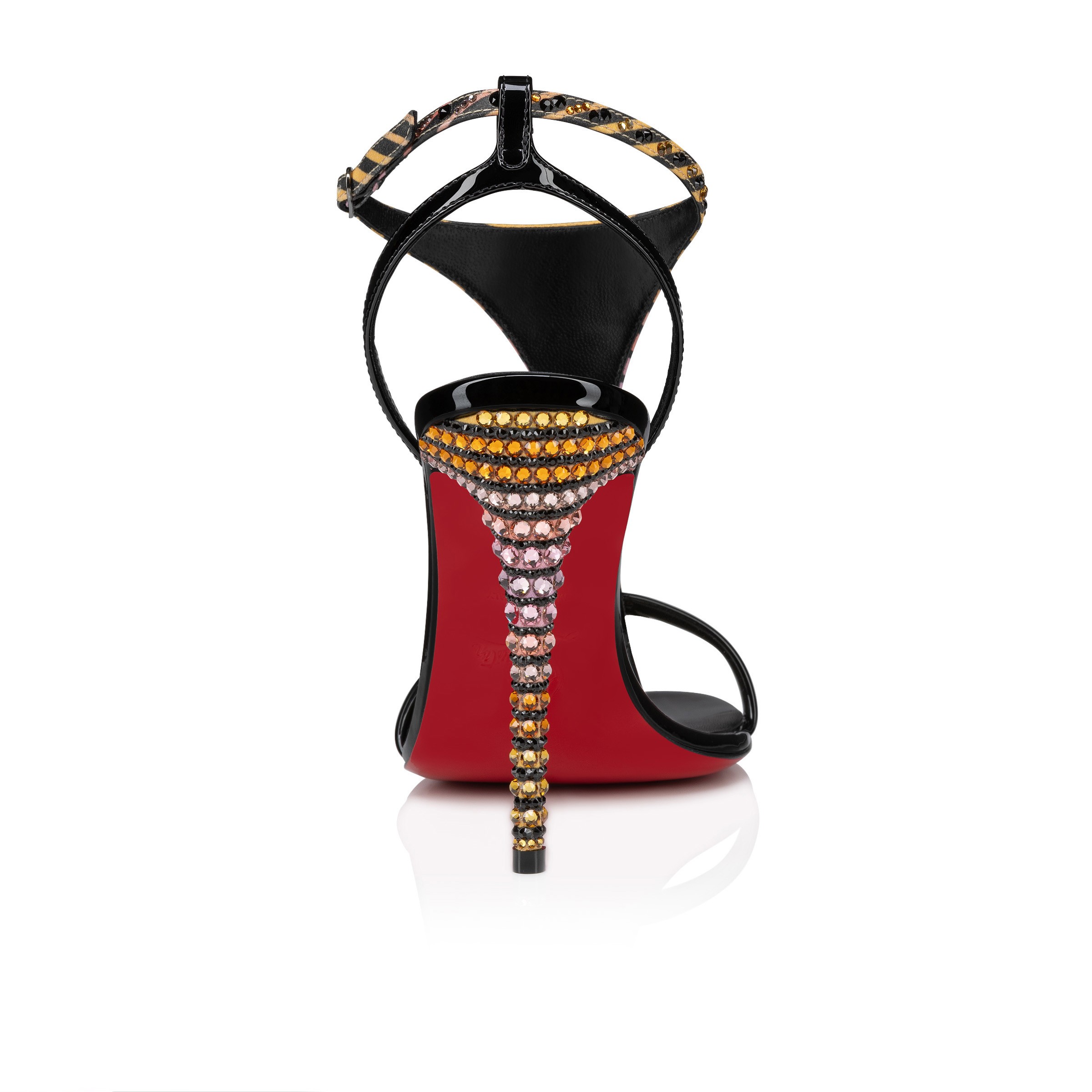 The Athina Strass Aftersun is a strappy high heel adorned with shimmering pink and gold strass on the 100 mm heel and t-strap. Featuring a black thong-style toe strap for ultimate comfort, this sandal is crafted from patent calf leather and crepe satin. Offering a glimpse of the iconic Maison Christian Louboutin red sole this sandal complements any outfit, day or night.