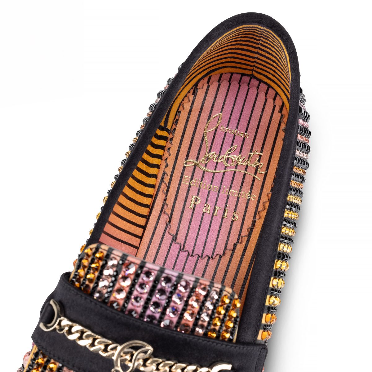 The MJ Moc Strass Aftersun sparkles with iridescent strass reminiscent of the setting sun. Embellished from heel to toe, this flat moccasin encompasses Maison Christian Louboutin elegance and catches the light from every angle. Crafted from multi-colored crepe satin and finished with a black satin band and signature CL chain, the sole offers a glimpse of iconic Loubi red with every step while the inner sole features a limited edition stamp.