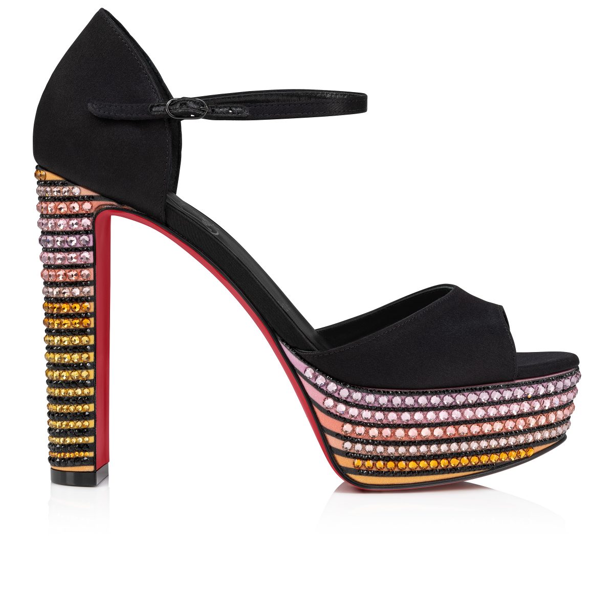 With its open toe, the Sandaloo elegantly reveals the foot. This platform sandal by Maison Christian Louboutin features a slim ankle strap and is set on a 130 mm square heel. This model is crafted in Aftersun colored crepe satin evoking the sunset. The platform sole is adorned with hand-placed strass.